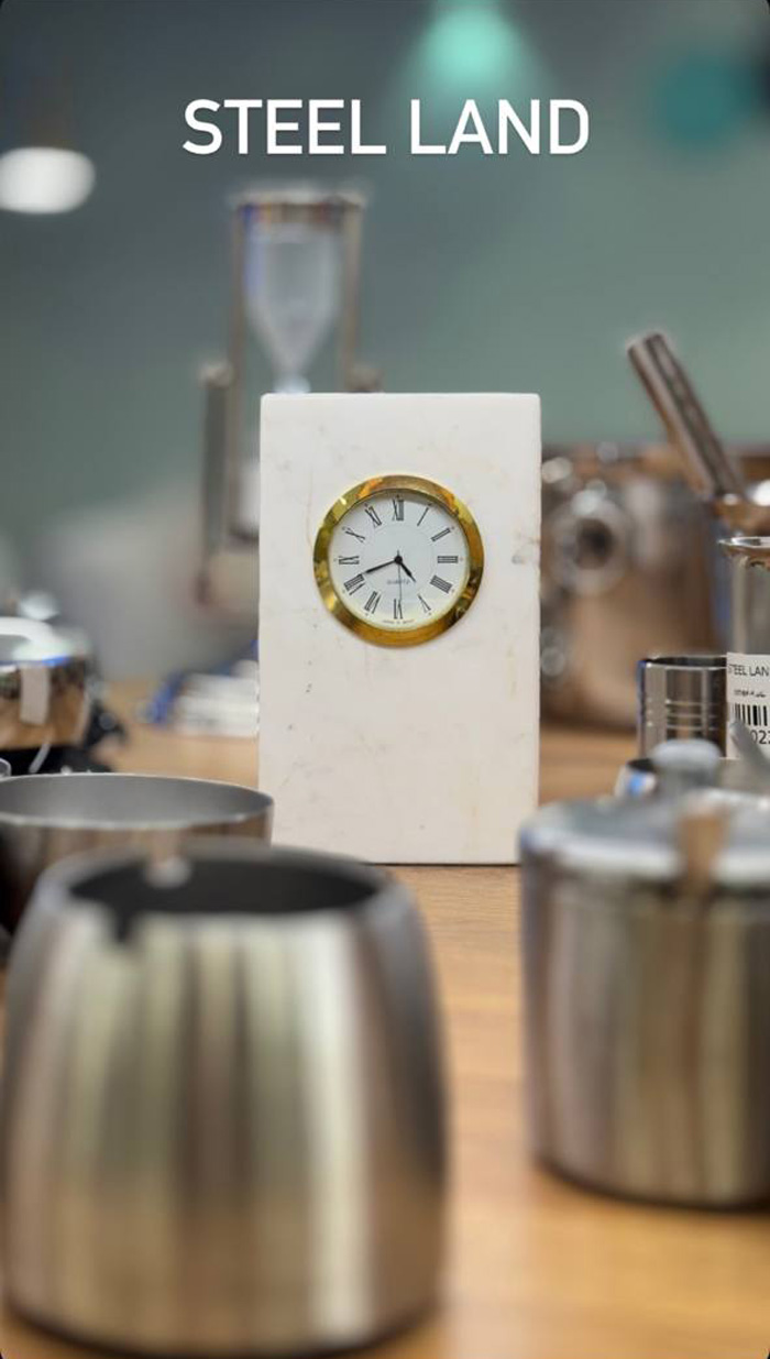 در مقایسه با مدلهای رزینی یا فلزی، ساعت لونا حس لمس سنگ واقعی را به شما میدهد. حتی انعکاس نور روی سطح آن طبیعیتر و دلپذیرتر است. قاب طلایی اطراف صفحه نیز با دقت پرداخت شده تا حس ظرافت و کیفیت ساخت را منتقل کند.برای مشاهده سایر مدلها و مقایسه طرحها به صفحه ساعتهای رومیزی استیل لند سر بزنید.